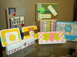I’ve been meaning to post this picture of the projects the SWAT Team came up with for our April get together for some time now. They are absolutely awesome!!! Our challenge was to use “Band-Aids” somehow to make a get well card or gift. We had a couple of different “first aid” kits, one including chocolate along with band-aids (what the band-aids won’t fix, the chocolate will!). One member did an easel card using the band-aid to hold up the easel part of the card, and a newbie to the group did a gorgeous get well card with no stamping at all… just her Cricut! I (unfortunately) didn’t plan very well, and had only made six cards. Well, with having an extra person there, I wasn’t able to keep one of my own cards — no big deal, but that’s why it’s not in the photo.